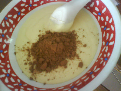 5) Scoop about half of the batter into another bowl, stir in the cocoa powder